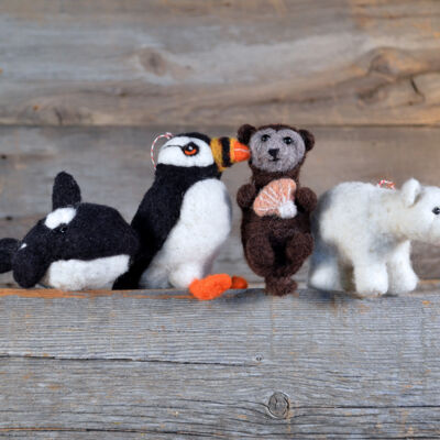We create needle felted items such as ornaments, car diffusers, felted soap,scuptures,dryer balls as well as needle felting kits, needle felted wreaths, natural dyed yarns, natural dye kits and a few natural dyed items such as bags and scarves. We also have art cards of our felted items, we do all the photography and lay out for them s well.