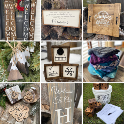 Woodworking items/home decor such as growth charts, signs, blanket ladders, wood mosaics, shelves, stools, benches, ornaments.