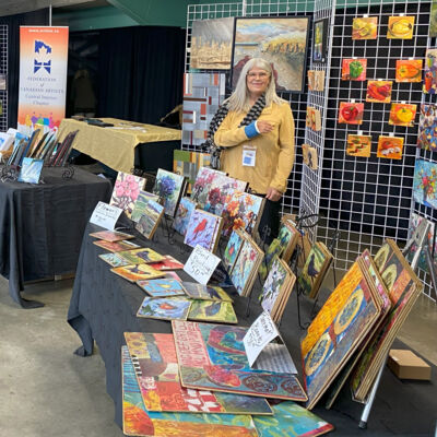 Hand-dyed silk scarves • polymer clay Christmas ornaments and pins • Handmade sterling silver scarf slides and earrings